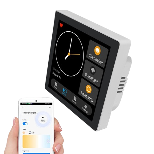 A comprehensive touch control panel featuring built-in Alexa voice control. Compatible with Zigbee/Tuya Eco home automation products, it includes an integrated gateway. In addition to managing light mood settings and curtains, the panel supports integrated gang relay control and equipment management.