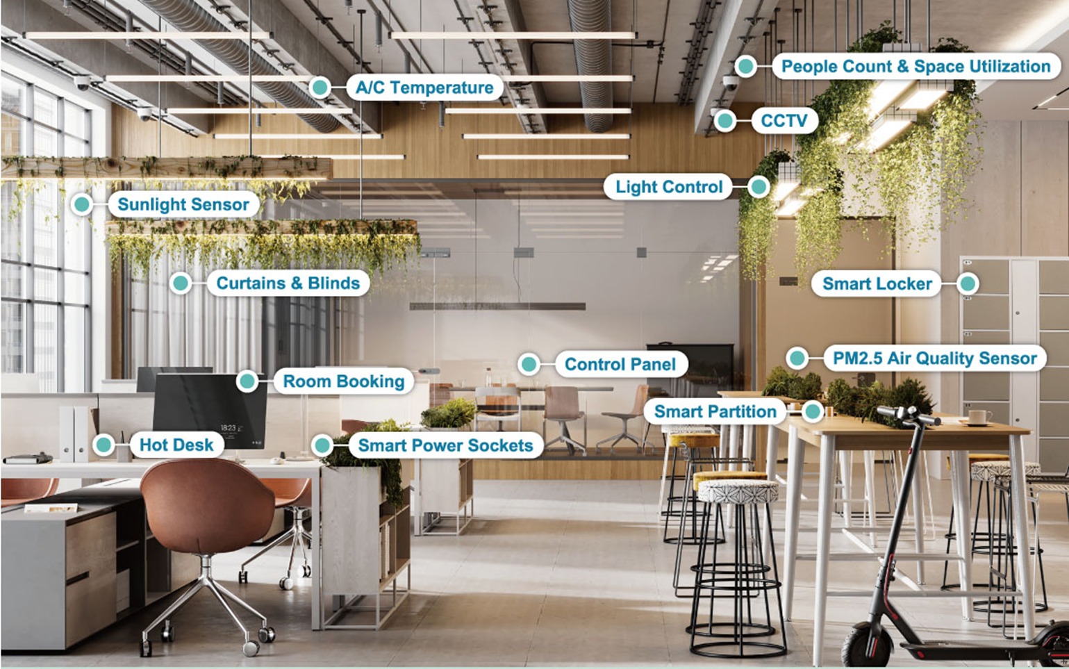Automated Lighting & HVAC : Sensors managing energy usage based on occupancy.